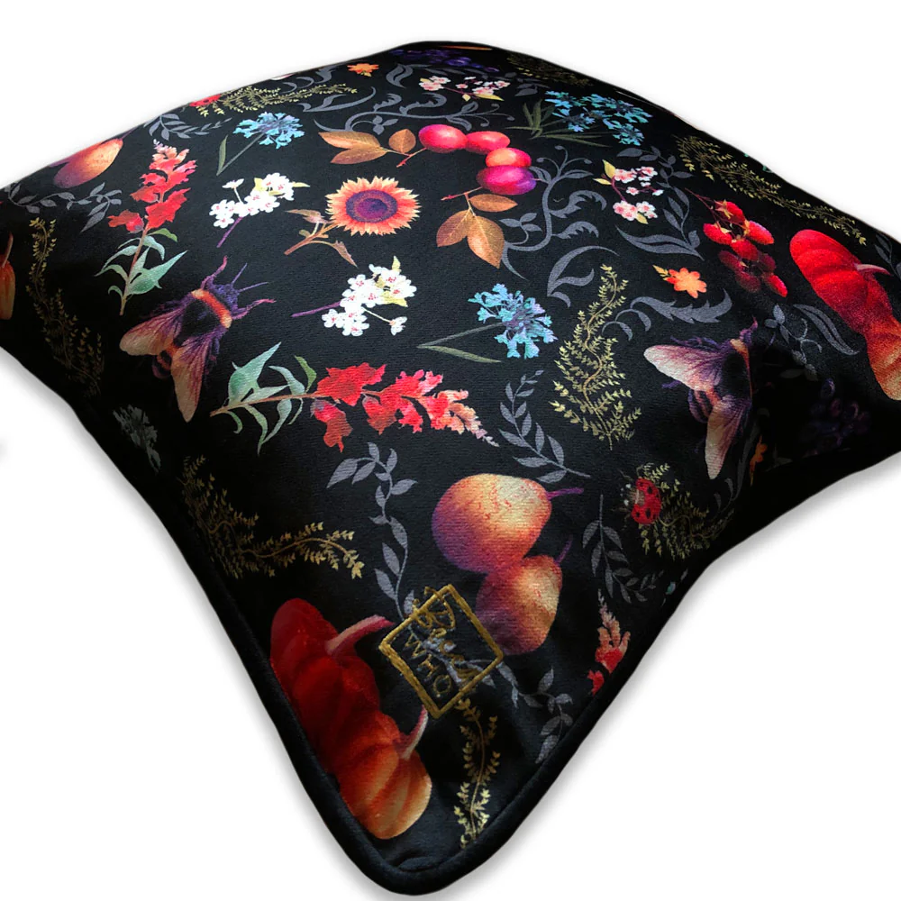 Luxury Bee Dance Cushion is filled with painterly details and rich jewel tones, printed onto sumptuous soft velvet.