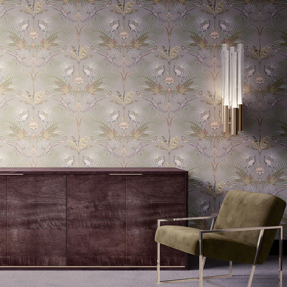 Sumptuous and beautiful on the wall, this luxury patterned wallpaper takes you on an exploration of the River Nile, with fearsome Crocodiles, DeMoiselle Cranes and lush foliage filling this design in an elegant composition. Designed to bring a timeless feel of luxury to your interior whilst creating a stunning talking point for your visitors.Ā