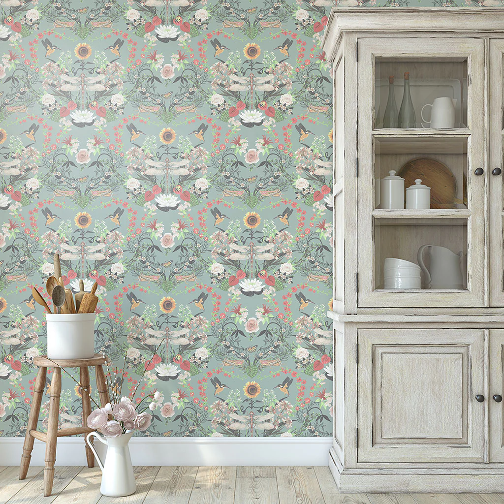 A perfect choice for countryside inspired homes, bring an irresistible charm to your space with this English country floral wallpaper. Painterly details, inspired by the sights of our summer gardens, fill this design for an eye catching result within your home decor. Evoking a carefree mood of beautiful days in the garden, the artwork celebrates the splendour of dragonflies, grasshoppers and birds amongst pretty florals in a beautiful composition.Â