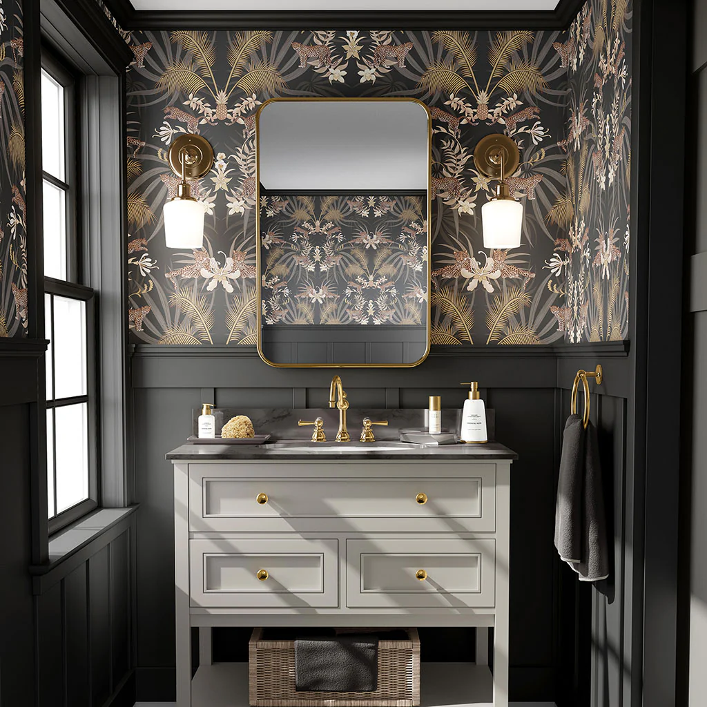 This luxury designer wallpaper features lazing and leaping Leopards on a beautiful, rich Charcoal with highlights of Gold. Opulent and inviting on the wall, this wallpaper creates warmth in an interior. Artwork of Leopards is accompanied by stunning highlights of golden palms and elegant touches of Ivory and Cream amongst the foliage and flowers.Â
