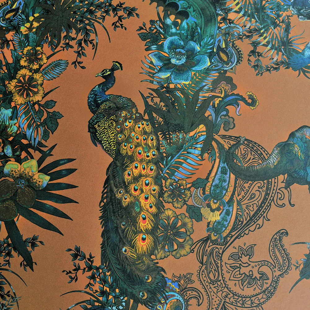 The Magic Of India wallpaper design presents a truly original aesthetic that is both timeless and versatile, complementing modern and traditional interiors alike. Whether in a cosy reading nook or an opulent dining space, this designer wallpaper envelops your room in memorable drama and elegance. This wallpaper is a beautiful choice whether for a single statement feature wall or all-over pattern for truly Maximalist home decor.Ā