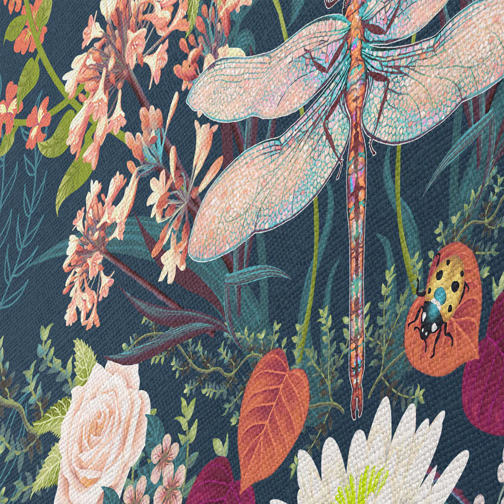 Celebrating the beautiful sights in our country gardens, this high quality canvas print brings a treasure trove of wildlife and florals to your interior. Striking composition features Kingfishers fluttering by a central Dragonfly, surrounded by garden flowers with colourful grasshoppers offering a quirky touch. On a muted Navy Blue background for a striking result on the wall.