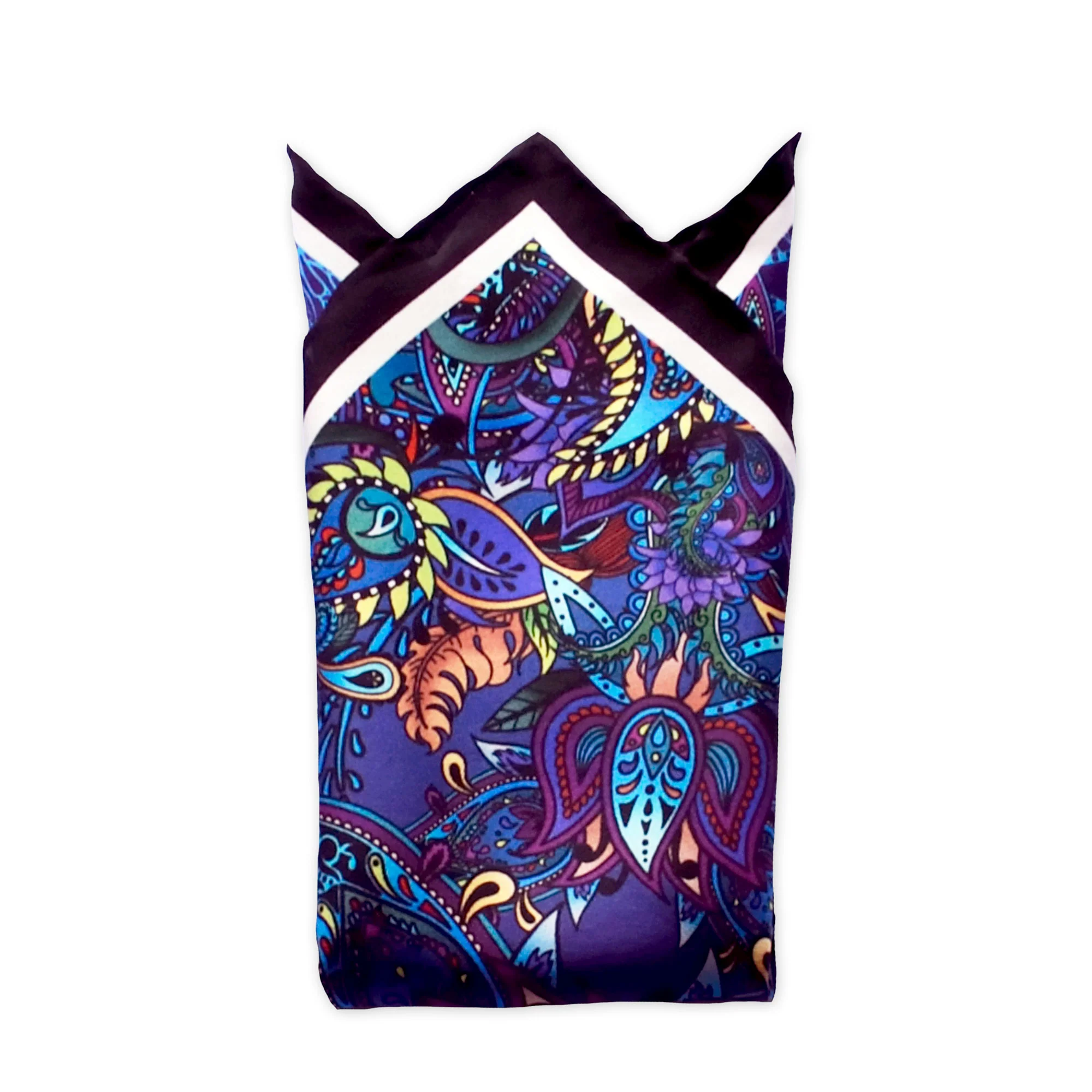 Luxury Pocket Square featuring hand drawn Paisley pattern in rich colours. Originally hand drawn in ink on paper, features paisley details inspired by plant life. In a rich colour palette including Indigo, Blues, Claret and Lime.