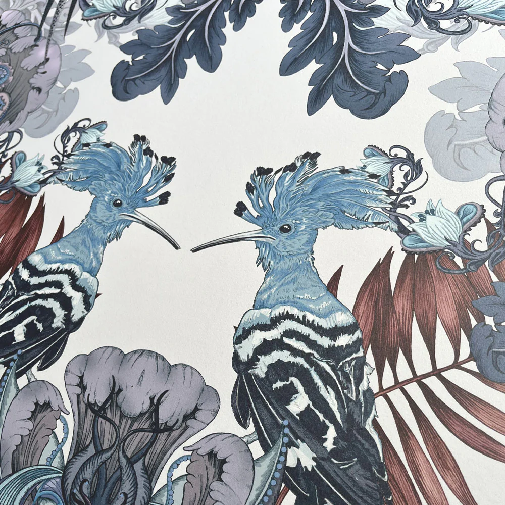 Depicting stylised florals with Golden Pheasants and Hoopoe birds perched amidst lush ornamental foliage, Parade of Plumes presents an elegant celebration of these majestic birds - beloved sights in the English countryside - for a design which is both captivating and refined. The composition exudes a sense of grandeur with symmetrical patterns, palms, and soft organic motifs.