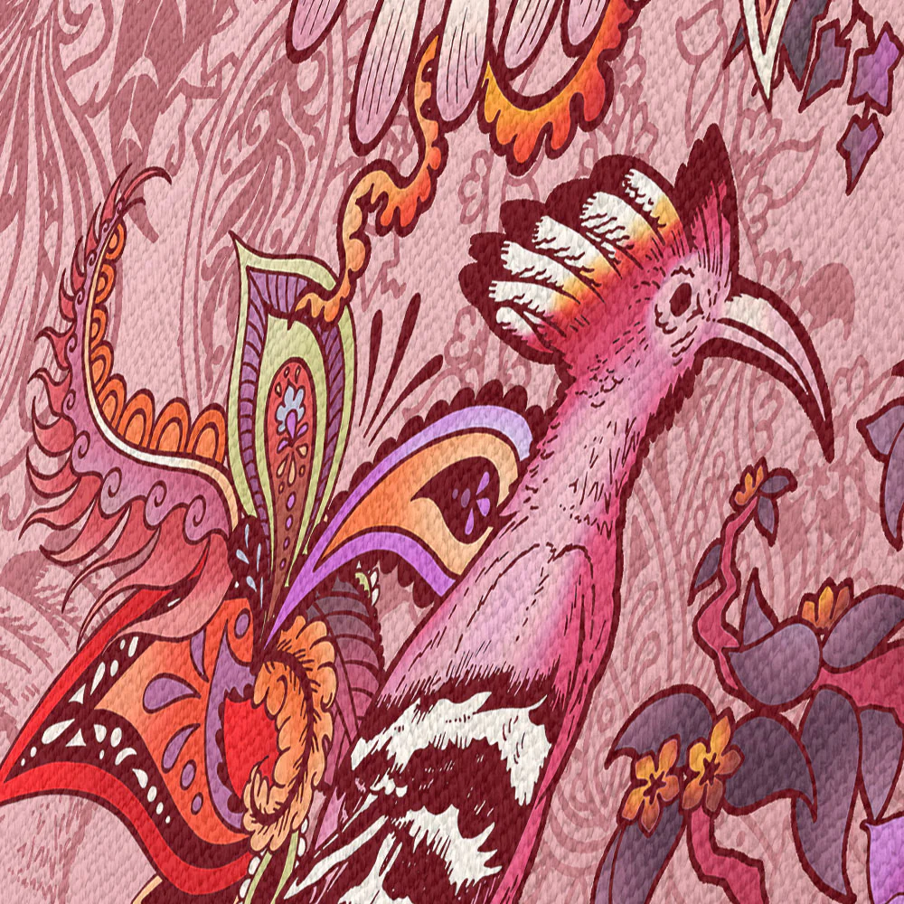 Simply beautiful on the wall, this elegant artwork of flowers and birds was created from Becca's original hand drawings. Hoopoe Birds and a Butterfly make a perfect accompaniment to the floral and ornamental elements. With detailed stylised leaves and petals, the flora offers pattern reminiscent of a Paisley design. Gorgeous colour palette of Pinks with touches of Earthy tones.