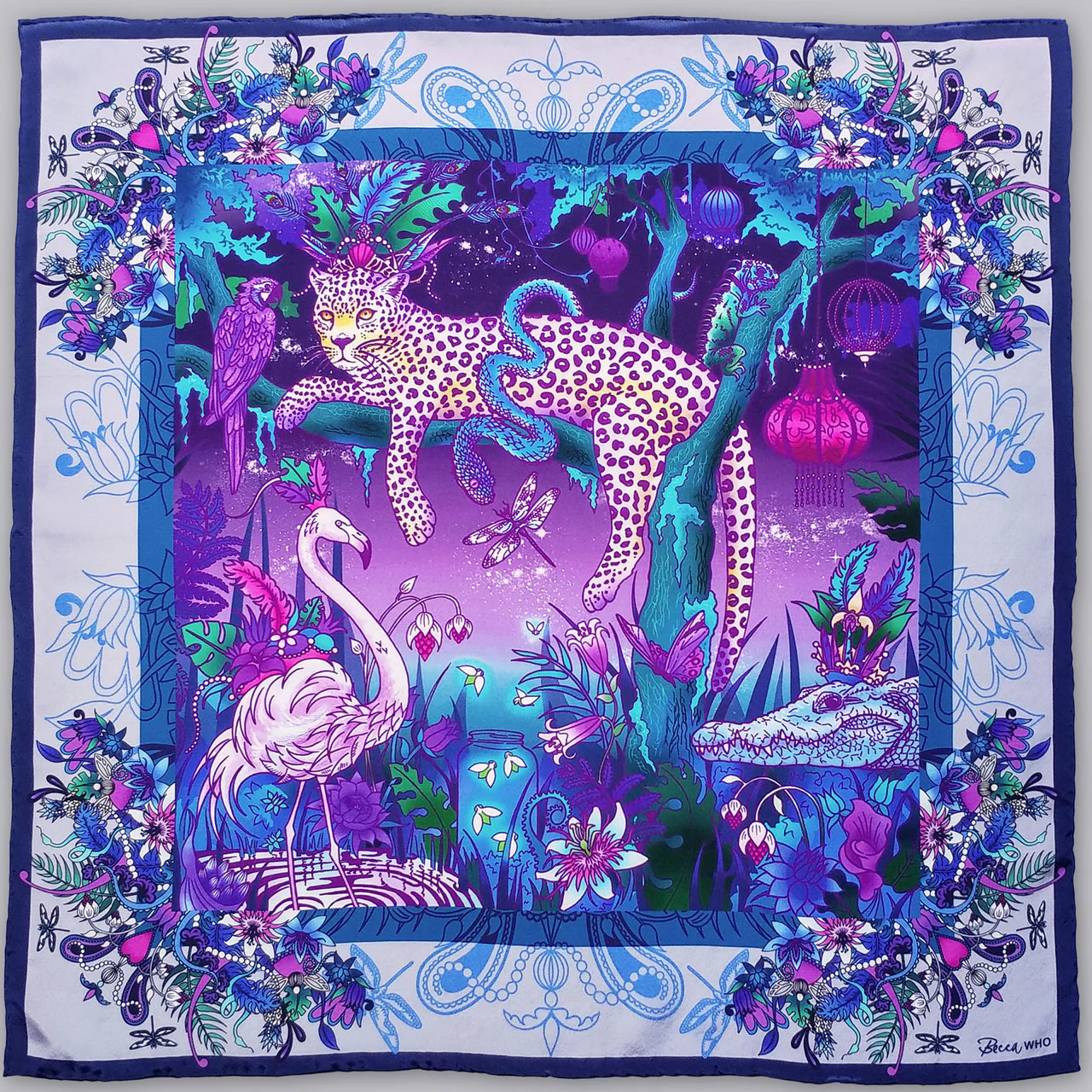 Stunning animals adorned with fabulous headdresses are the centre of this enchanting design. Set in an exuberant backdrop of nature interspersed with ornament for a surreal & truly magical vibe. A beautiful Leopard is joined by a regal Flamingo and an Alligator, for a surreal scene of beauty. With an intricately detailed border design. The colour palette offers rich Purple tones complimented by Teal Greens and vibrant bursts on a sophisticated soft Grey. The Regal Leopard Scarf is an original and creative design.