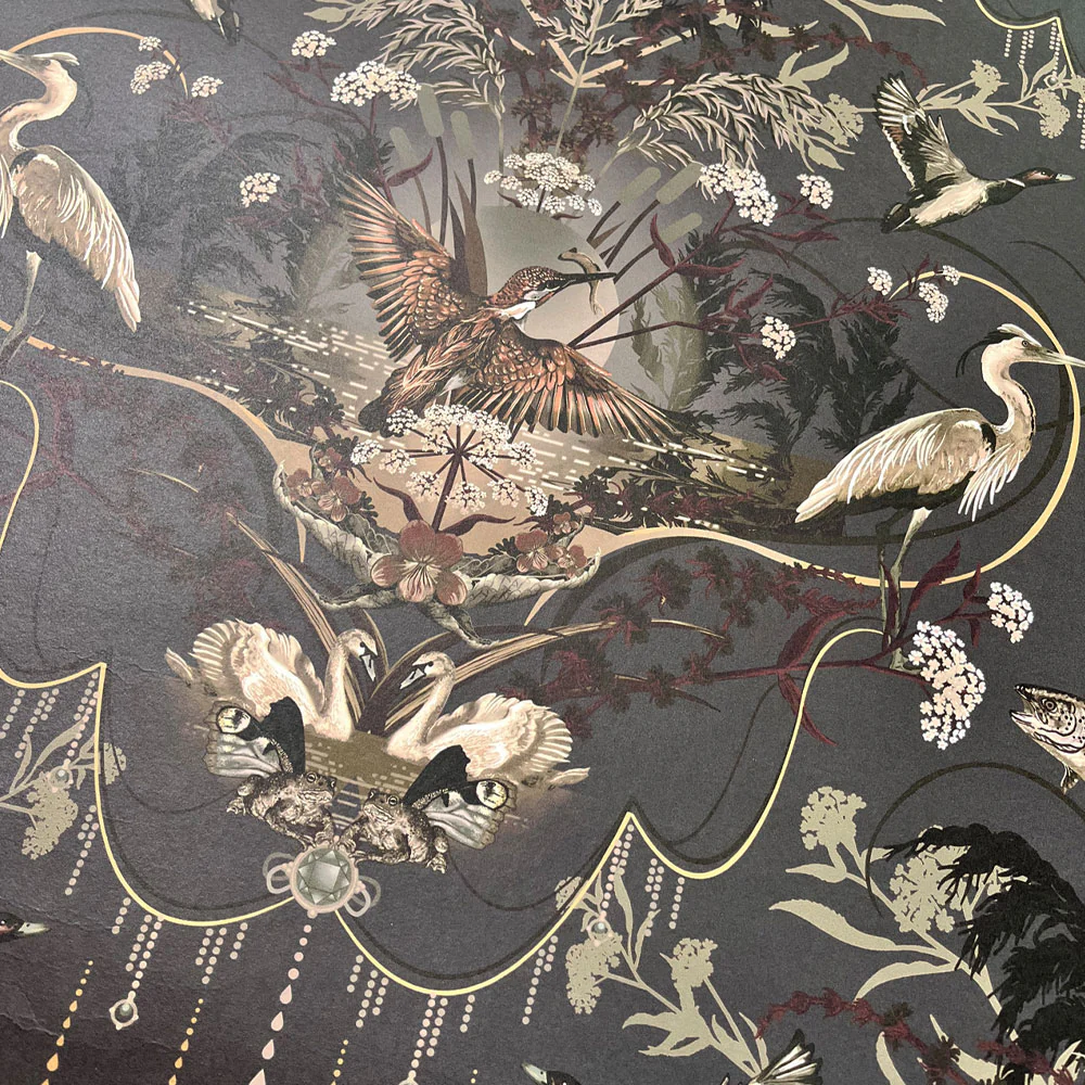 Enjoy the rich elegance of River Sonata Luxury Designer Wallpaper in Nightshade, bringing the English riverside to interiors in statement Charcoal and Gold. Filled with intricate painterly details, the River Sonata Wallpaper offers an elegant composition, perfect for creating opulent, statement interiors. This design originates from the exquisite original artwork of British designer, Becca Who.