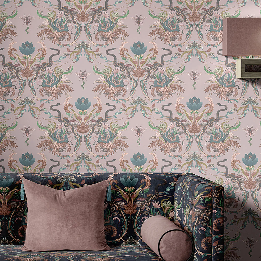 Elegant and provocative, this luxury designer wallpaper is captivating on the wall, with snakes entwined amongst stylised florals and foliage. Serpentwined wallpaper is filled with delicate painterly details on a light, muted pink. The snakes and floral combination make this a talking point in any interior. Evocative of traditional design, Serpentwined brings a classic feel but with a contemporary twist.