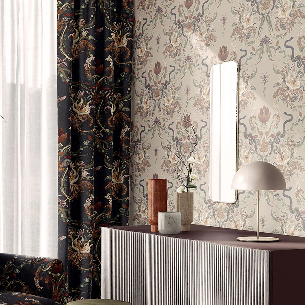 Elegance with a touch of the unexpected, this luxury designer wallpaper is a beautiful talking point on the wall, with snakes entwined amongst stylised florals and foliage. Delicate painterly details fill the Serpentwined wallpaper in a design which is reminiscent of traditional decor, but with a contemporary twist.