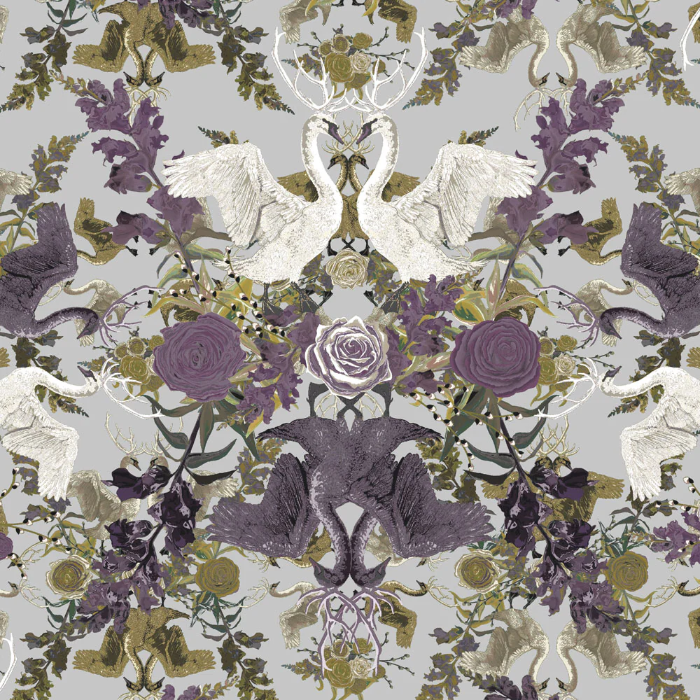 Elegant Swans adorned with Antlers display their silky feathered wings amongst roses, snapdragons and willow. Softly painted details fill the scene, making for a design which celebrates the majesty of the British countryside. Impeccably printed onto tactile velvet with beautiful detail.