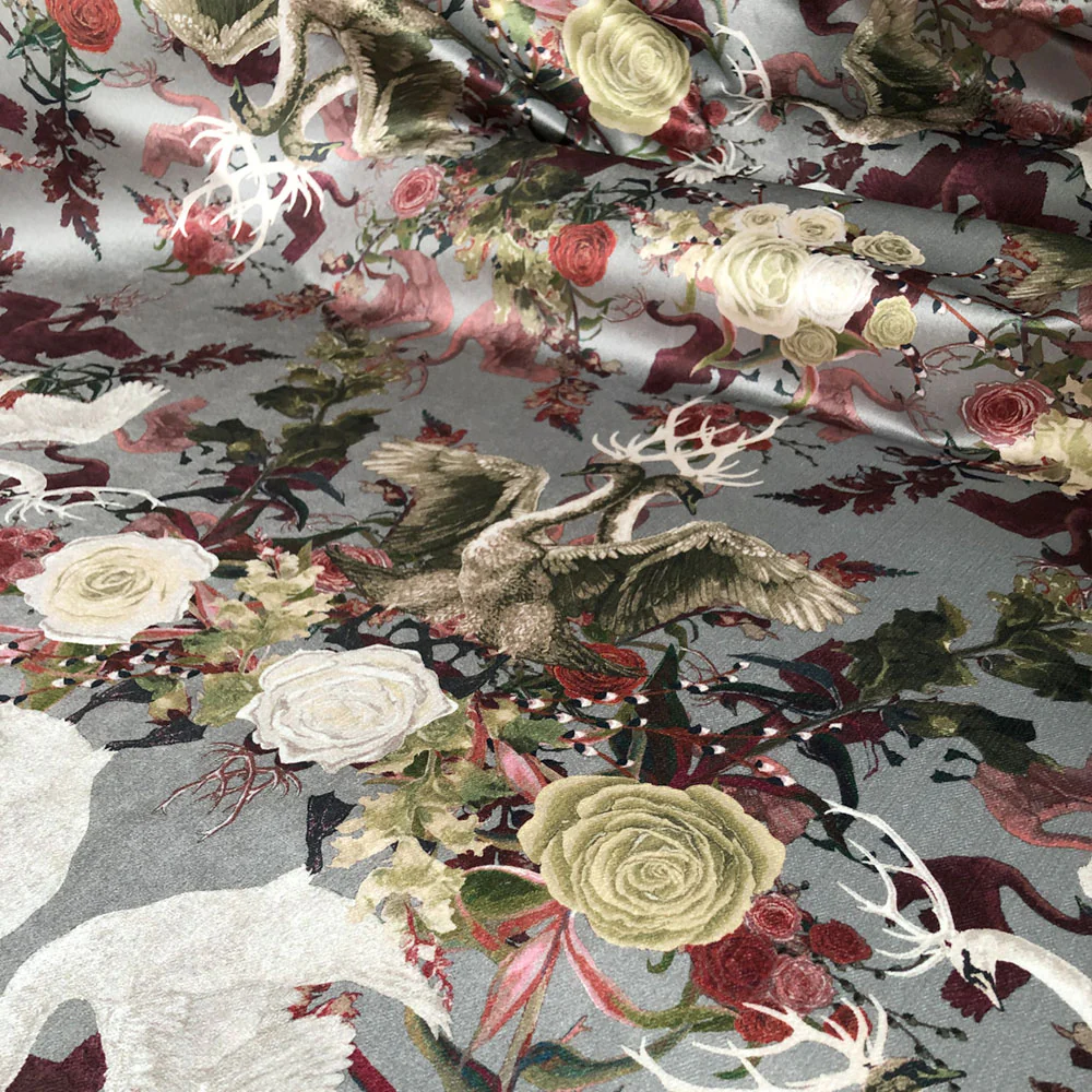 This rich colour palette is of a warm Grey background, accented by the Ivory swans and with touches of Claret, Dusky Pinks and Greens. Makes for a beautifully classic interior. A fabulous velvet which results in stunning finished products.Ā