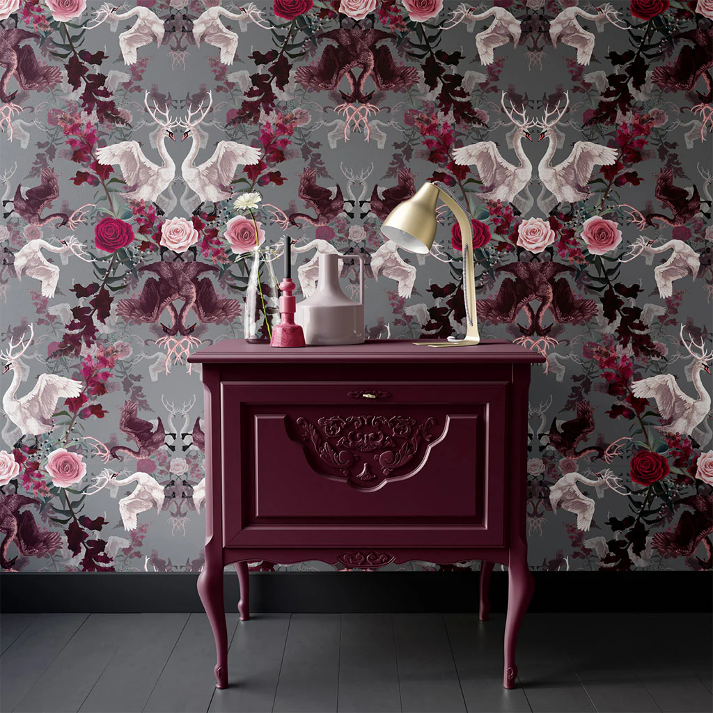 Masquerade is a most opulent and dramatic colour way of Swan Song, with Claret and Pinks on a shimmery mid Grey background. A smooth matte finish to the paper adds to the luxury. Swan Song is a rich design, filled with painterly Roses, Snapdragons and the silky feathered wings of Swans, making for an unforgettable interior.Â