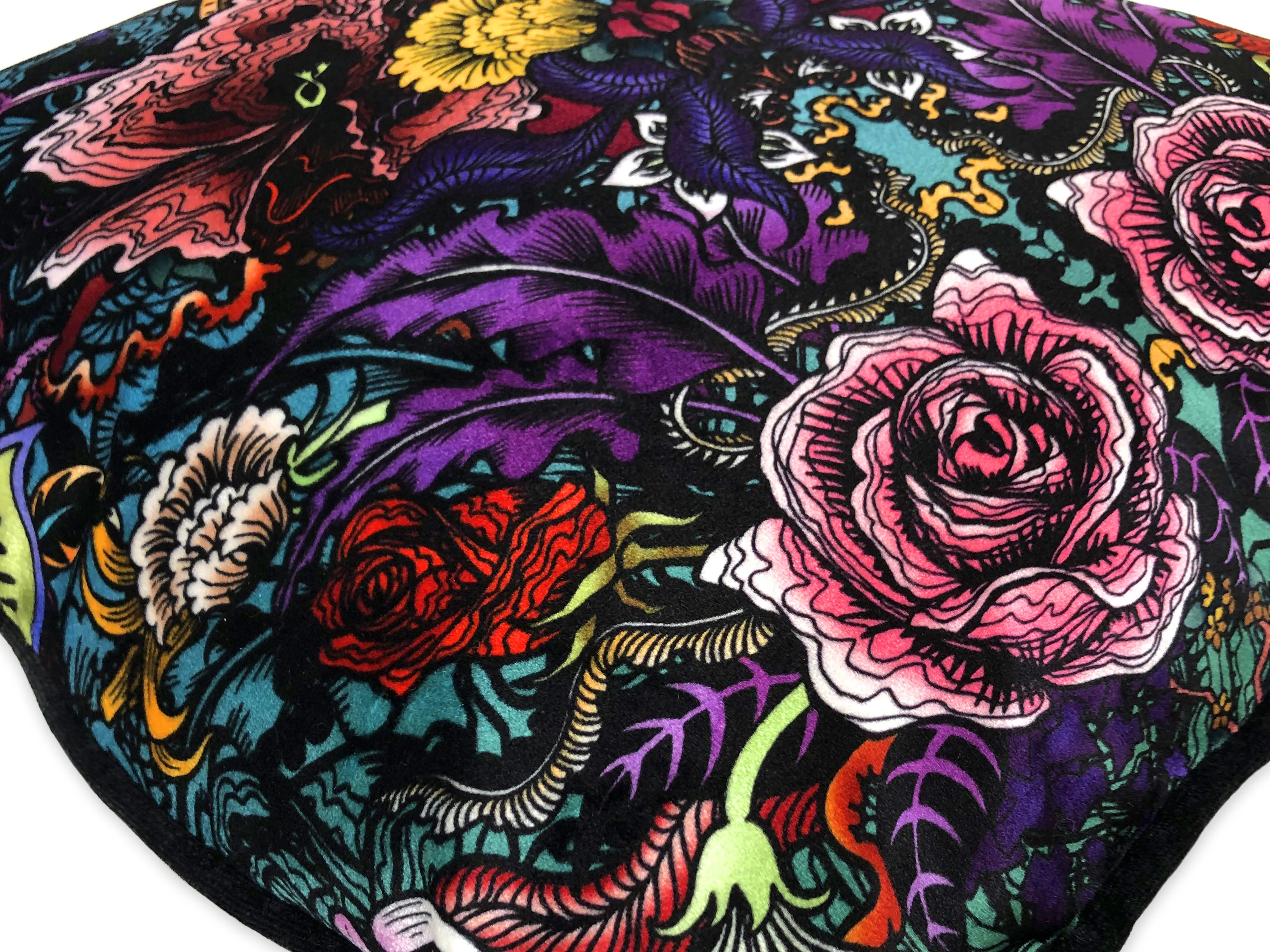 Vibrant artwork in rich jewel tones, printed onto sumptuous soft velvet