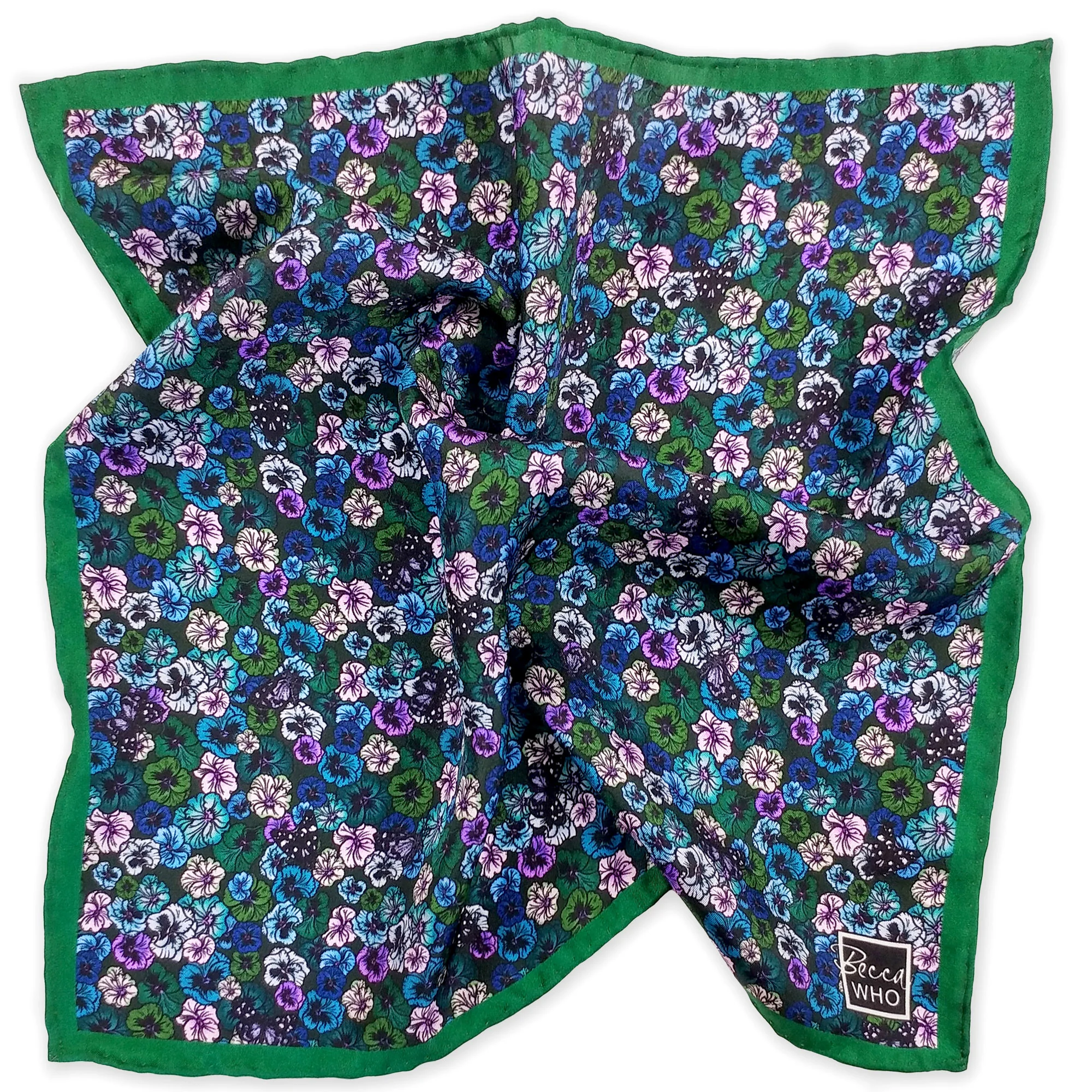 Wild Pansy and Moths print design in beautiful green tones. Features hand drawn artwork, floral pattern amidst detailed Moths, for a print of elegantly rich colour. Bring a touch of luxury and originality to an outfit with this elegant pure silk Pocket Square.Â