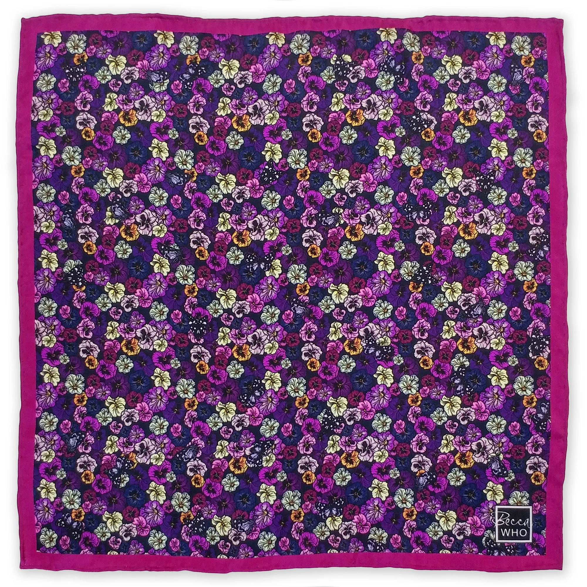 Wild Pansy and Moths print design in striking purple tones with a deep Magenta border. Features hand drawn artwork, floral pattern amidst detailed Moths, for a print of vibrant colour. Bring a touch of luxury and originality to an outfit with this elegant pure silk Pocket Square.Ā